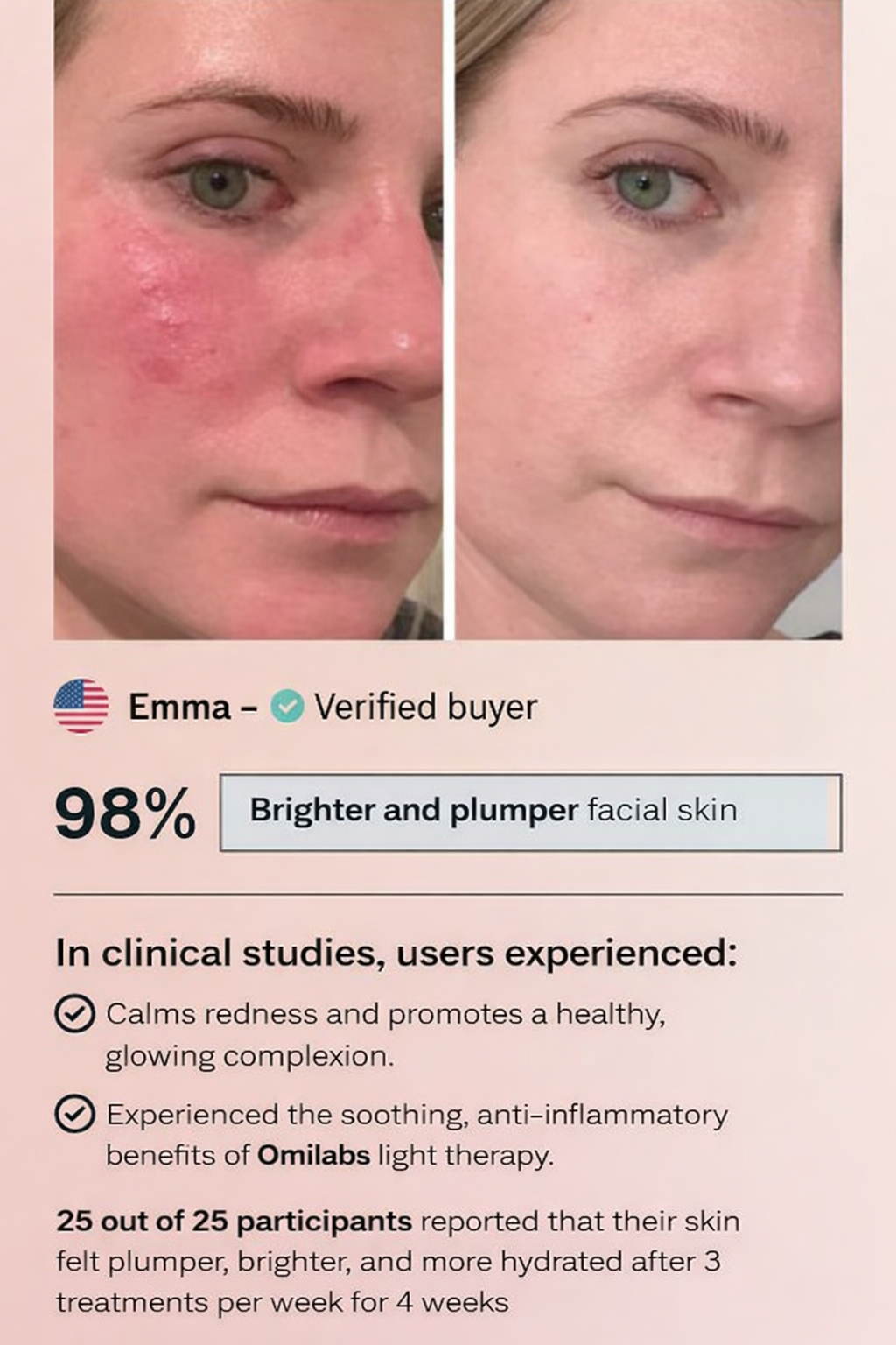Omilabs uses clinically inspired light-emitting diodes (LEDs) that deliver specific wavelengths of light to the skin. These wavelengths support collagen appearance, smoother texture, and a more even-looking complexion — without invasive treatments.